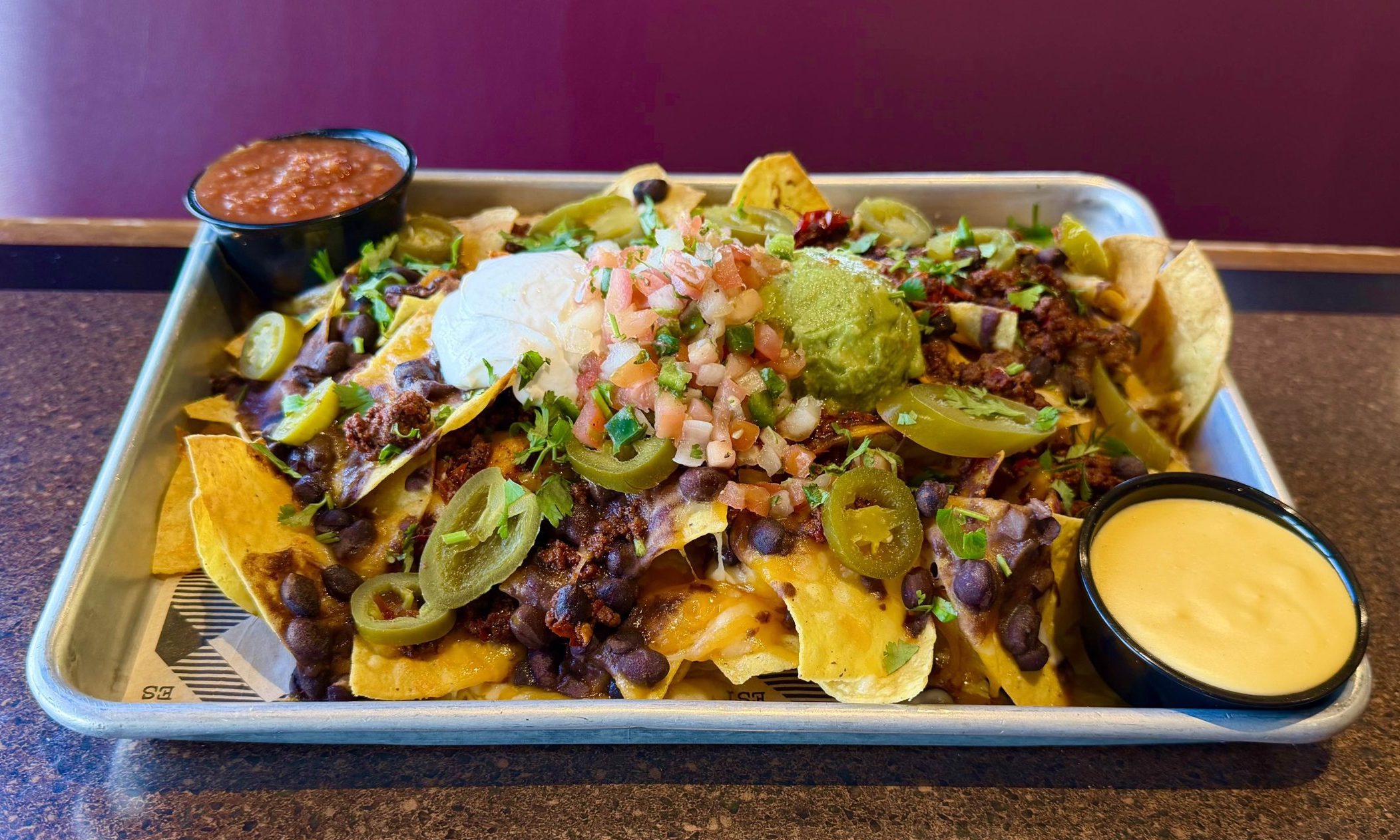 Cheddar jack, black beans, sour cream, roasted jalapeños, cilantro, salsa, pico de gallo, guacamole, and cheddar cheese sauce. $14.99